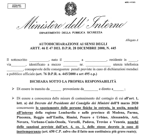 | first version of the declaration required for travel, later extended to the whole of Italy |