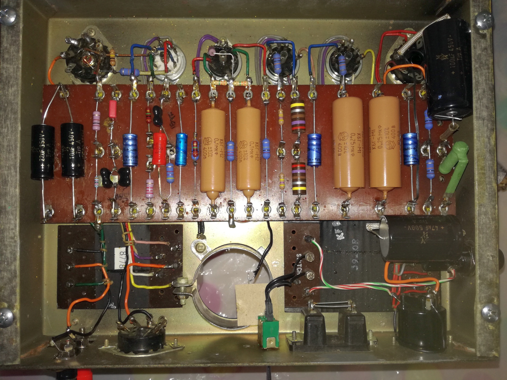 The multiple capacitor is far from the rectifier; in fact, as we can see below, the salami-style binding of the wires originally lengthened the path even further.