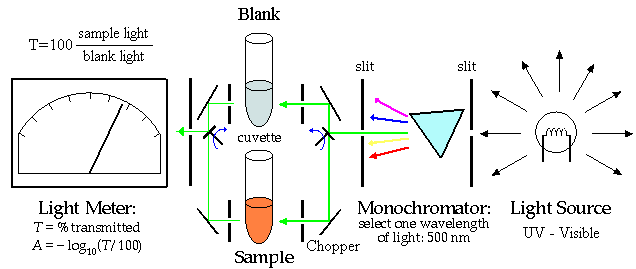 Iniziamo con un bel disegno (preso da un sito Internet ma pesantemente modificato) che mostra con semplicita' la struttura di uno spettrofotometro, doppio raggio, che sfrutta la legge di Lambert-Beer.