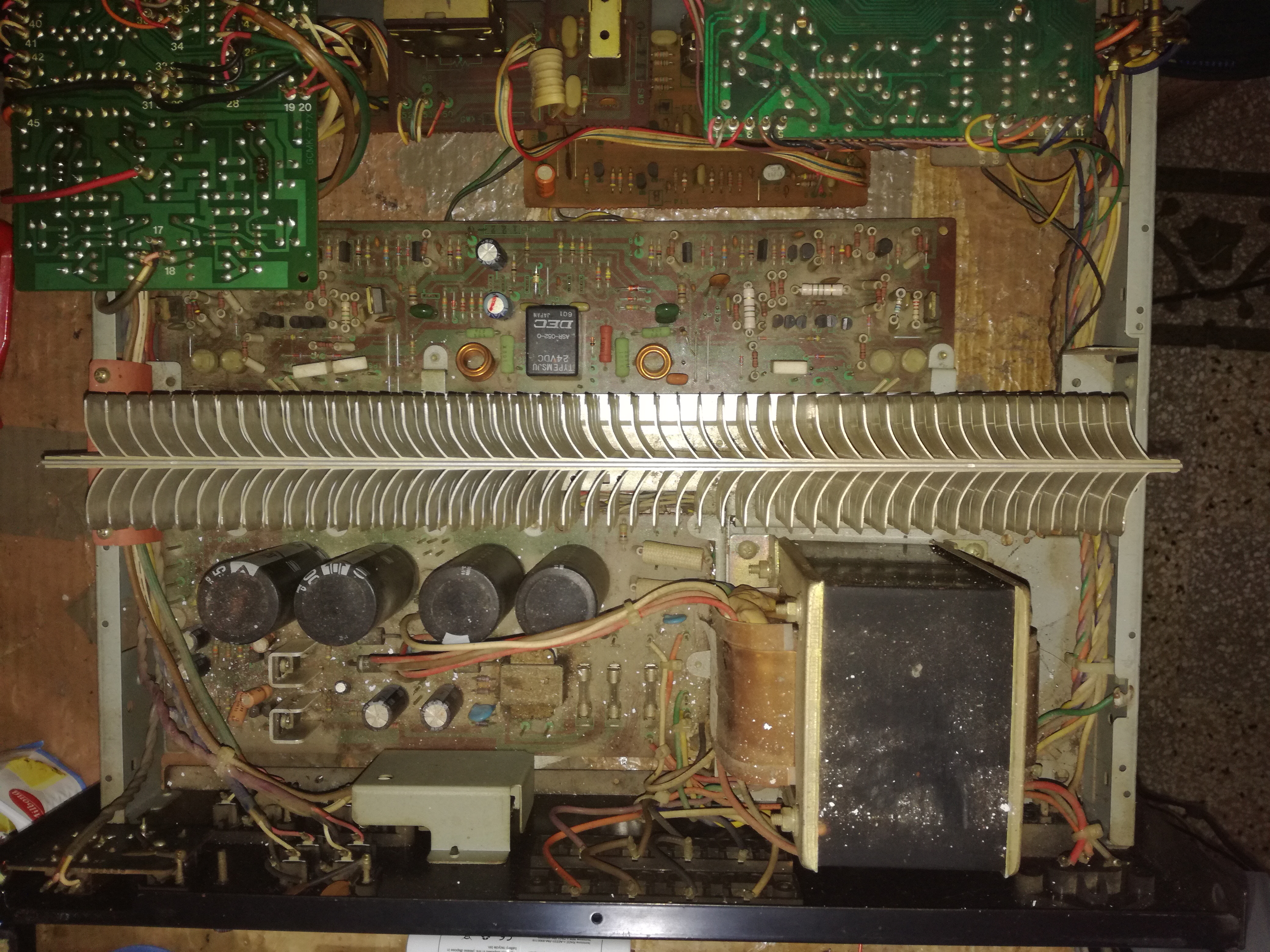 | Fig.4, let's take a look at the power supply section. You can see the second transformer on the right, the 4x 8000μF/50V Nichicon capacitors in the centre, and the stabilisation circuit on the left. Some liquid has been spilled and there is a lot of dust |